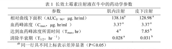 本品按1ml/10 kg體重(20mg土霉素/ kg體重)的劑量給牛一次肌肉或皮下注射本品后,平均藥代動力學(xué)參數(shù)如表1所示: